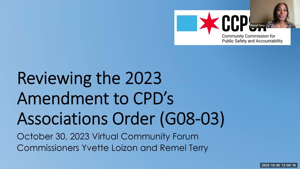 March 18, 2024 Commissioner Yvette Loizon and Commissioner Remel Terry hold webinar, focusing on additional revision to CPD policy, "G08-03 Prohibitions on Criminal and Biased Organizations."
