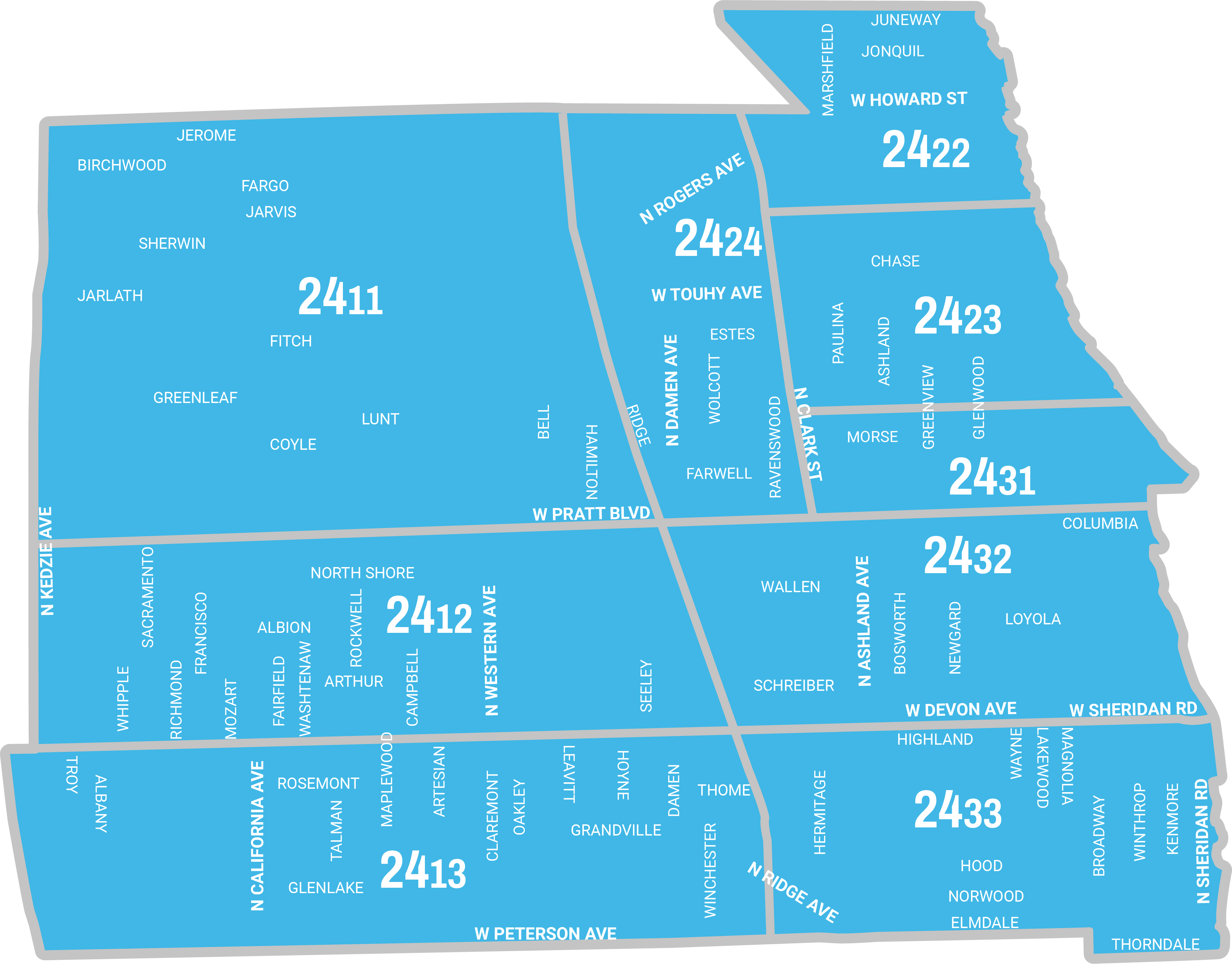 Neighborhoods in the 24th District Council include: Edgewater, Rogers Park, and West Ridge.