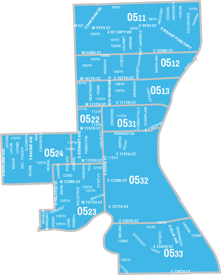 Neighborhoods in the 5th District Council include: London Town, Calumet Heights, Rosemore, Cottage Grove Heights, Pullman, West Pullman, Altgeld Gardens, Riverdale, Roseland.